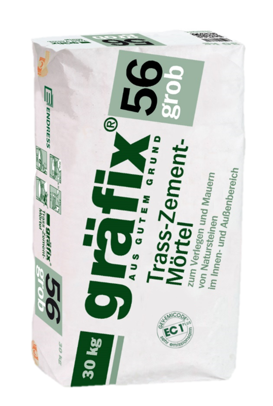 Mauermörtel auf Trass-Zement-Basis mit Kalksteinbrechsand bis 4 mm und verarbeitungsverbessernden Zusätzen zum Vermauern und Verlegen von Natursteinen wie z. B. Basalt, Granit und Porphyr. Gutes Wasserrückhaltevermögen verhindert zu schnelles Austrocknen. Das Grobkorn lässt höhere Schichtdicken zu. Trass unterdrückt Kalkausblühungen und gewährleistet gleichmäßiges Abbinden. Für die Verlegung empfindlicher Natursteine wird gräfix 434 empfohlen.