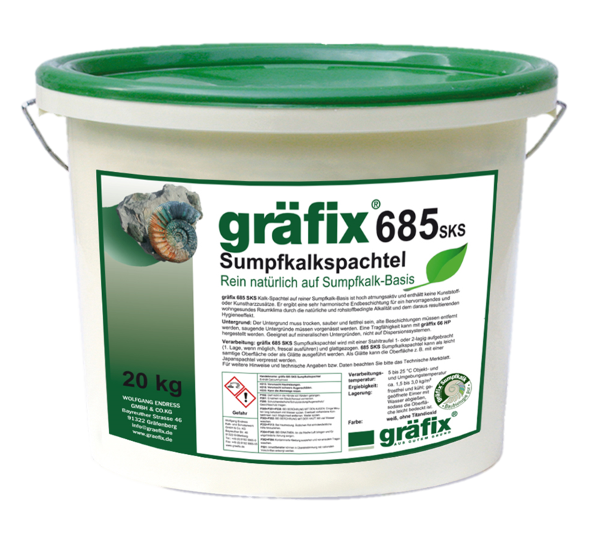 Reiner und sehr weißer und hoch atmungsaktiver Sumpfkalkspachtel ohne Zusatz von Kunstharzanteilen. Die Fähigkeit zur Aufnahme von Stickoxyden und der Aufnahme von flüchtigen organischen Verbindungen (VOC) durch Clean Air Effekt, ist auch reinen Sumpfkalk-Oberputzen und reinen sumpfkalkbasierenden Kalkfarben gegeben. In der Harmonie mit dem Kalkgrundputz bilden sie ein unschlagbares Klima- und Reinigungssystem für unsere Innenräume. gräfix 685 SKS wird zum Herstellen von glatten, oder für individuelle und kreative Gestaltungen, sehr edlen, samtigen Oberflächen verwendet.